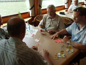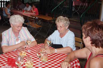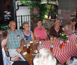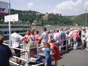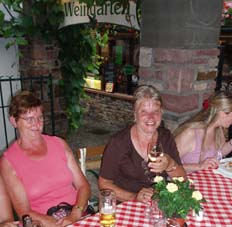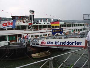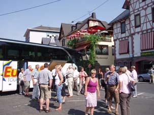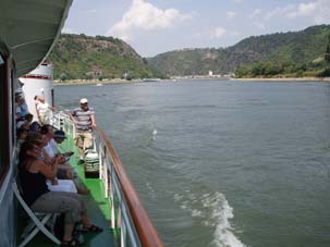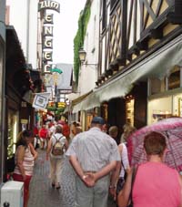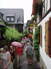 Nach dem Passieren vieler Burgen mit romantischen Dörfern und des Niederwalddenkmals erreichte man schließlich Rüdesheim. Trotz einer kleinen Erfrischung durch ein Gewitterschauer war dort natürlich die Drosselgasse das Ziel