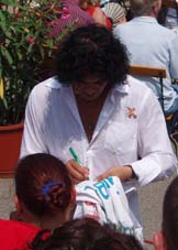 Einen Gruß an "Kiwi" und den Fernsehgarten hatten die Goxeler mitgebracht, anschließend wurde das Transparent mit Autogrammen von Andra Kiewel und einigen der auftretenden Stars versehen. Hier unterschreibt gerade Costa Cordalis.