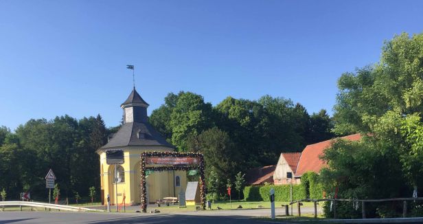 Auf dem Hof Langehaneberg nahmen die Gastvereine bei herrlichem Sommerwetter Aufstellung. Mit dabei natürlich auch König Johannes, auf dem Bild mit seiner Königin Angelina und den Ehrendamen Tatjana und Linda.
