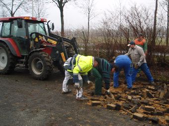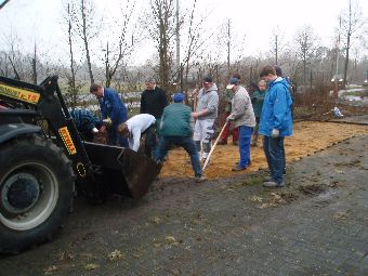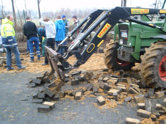 Rund um die neue Schützenhalle des Goxeler Schützenvereins war noch einiges zu tun. So sollte die Vorfläche gepflastert werden. Kurzfristig konnte der Verein Pflastersteine bekommen. Diese mussten kurzfristig aus Coesfeld abgeholt werden. Auf eine sehr erfreuliche Resonanz fiel der Aufruf zur Mithilfe. Am 11. und 12. Februar 2011 (Freitag/Samstag) konnte mit reichlich Gerät, Traktoren, Anhängern und - vor allem - zahlreichen Helfern die Aktion gestartet werden. Mehrere Hundert qm Pflastersteine wurden gelockert, aufgeladen und abtransportiert. Am Samstag konnte gegen Mittag dank des tollen Engagements die Aktion abgeschlossen werden. Allen Helfern - vor allem bei dem Einsatz bei dem miserablen Wetter am Samstag - ein herzliches Danke!
