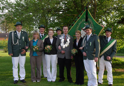 Der neue Thron stellt sich dem Fotografen: v.l.n.r.: Adjutant Lars Bosman, Ehrendame Kathrin Nünning, Fahnenoffizier Christian Roß, Königing Jennifer Langener, Fahnenoffizier Michael Schulten, König Steffen Treptow, Adjutant Markus Hollstegge und Fahnenoffizier Marco Vogt.
