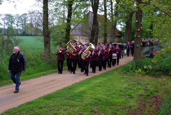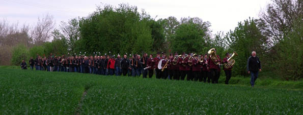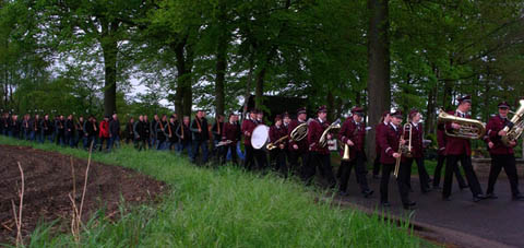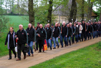 Mit musikalischer Begleitung des Jugendblasorchesters Hochmoor wurde die Vogelstange vom Hof Kaup abgeholt und zum Standort gebracht, versehen mit einem Satteltrunk des Königsthrons um Alois Bosman und Maria Barenbrügge.