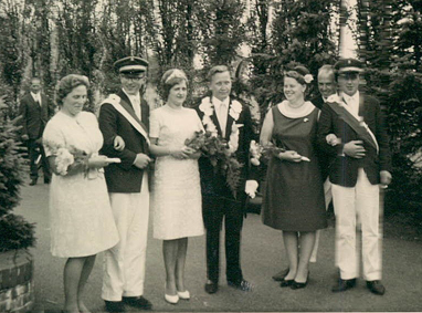 Das Bild zeitgt den Königsthron in Goxel vor 50 Jahren mit (v.l.n.r.) Ehrendame Elisabeth Sahlmann, Adjutant Hugo Sueck, König Walter Schulte mit Königin Adele Farwick, Ehrendame Else Schulte und Adjutant Karl Barenbrügge.