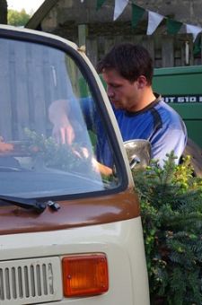 Fahnenschmuck wurde aufgehängt und ein Kranz für den Königswagen gebunden und angebracht ...