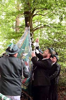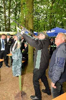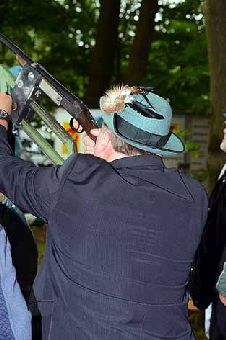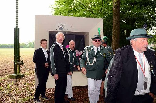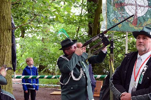 Pfarrer Hammans gab traditionell den ersten Schuss ab. Als Noch-König Johannes Gerding den zweiten Schuss abgab, war der Vogel bereits arg gestutzt.