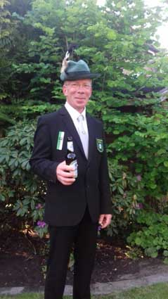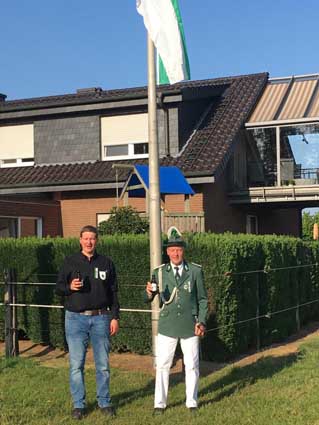 Natürlich hisste auch König Daniel Hüwe (links) mit Oberst Walter Hüwe die Schützenfahne. Wer beide mit musikalischer Unterlegung in Aktion sehen möchte, kann hier klicken!
