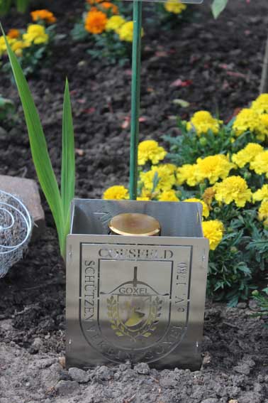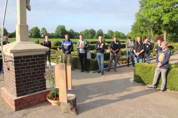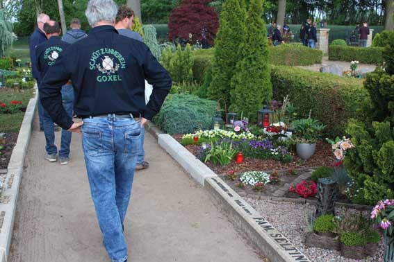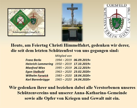 Zu den festen Bestandteilen des Goxeler Schützenfestes gehört die Totenehrung zu Beginn des Gottesdienstes in der Herz-Jesu-Kirche. Obwohl das Schützenfest und damit auch die Schützenmesse in der Kirche in diesem Jahr wegen der Corona-Pandemie ausfällt, gedenkt der Verein am Feiertag Christi Himmelfahrt der Verstorbenen. Vorstand und Offiziere erwiesen dazu den seit dem Schützenfest 2019 verstorbenen Mitgliedern die Ehre, diesmal auf dem Goxeler Friedhof.