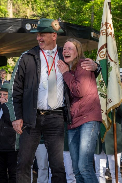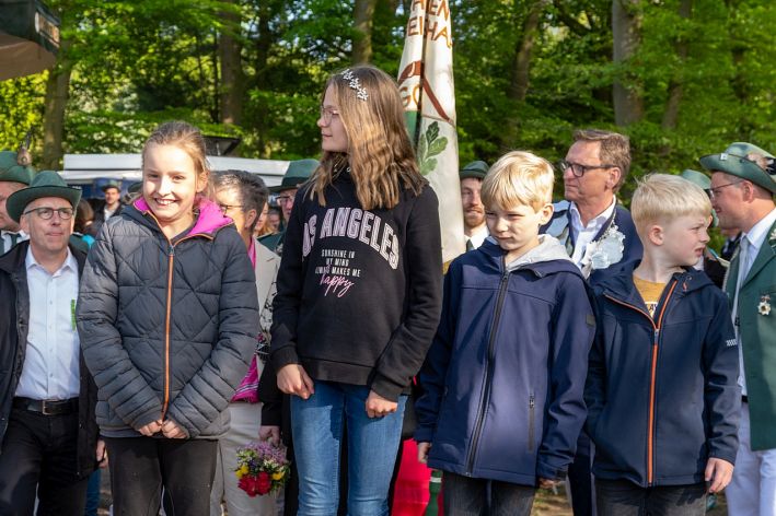 Bei den Kindern war bald die Entscheidung schon gefallen, Jona Roß gelang es, die letzte Magnetscheibe vom Papageivogel zu treffen. Seine Königin wurde Mila Völker, der Kinderthron wurde vervollständigt mit Filou Bertels, Pia Steinkamp, Casper Nünning und Theo Bosman.