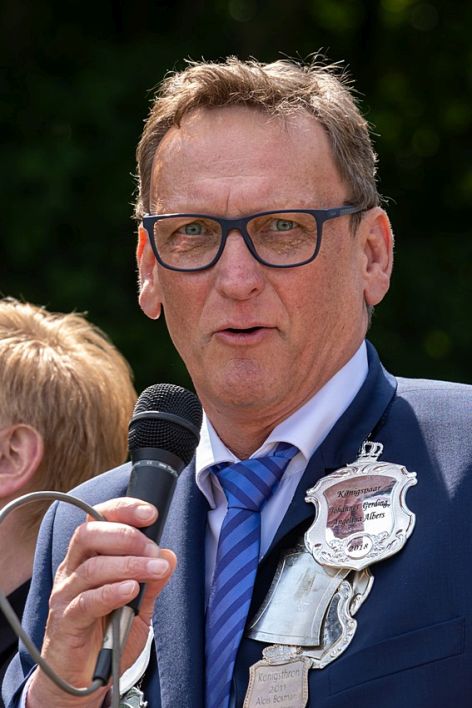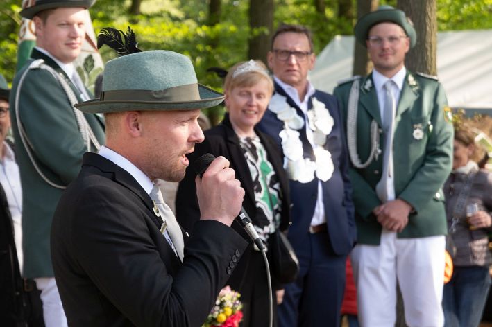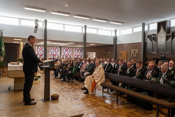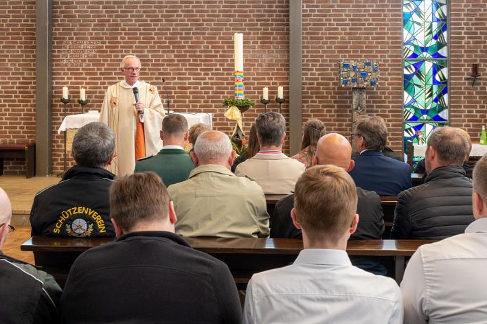Pfr. Johannes Hammans begrüßt anschließend den Königsthron, den Kinderthron und die Schützen mit vielen Gemeindemitgliedern. Wie immer versteht er es in der bekannten lockeren Weise daran zu erinnern, welche Bedeutung traditionelle Feste haben. Dabei ließ er den christlichen Feiertag Christi Himmelfahrt nicht außen vor.