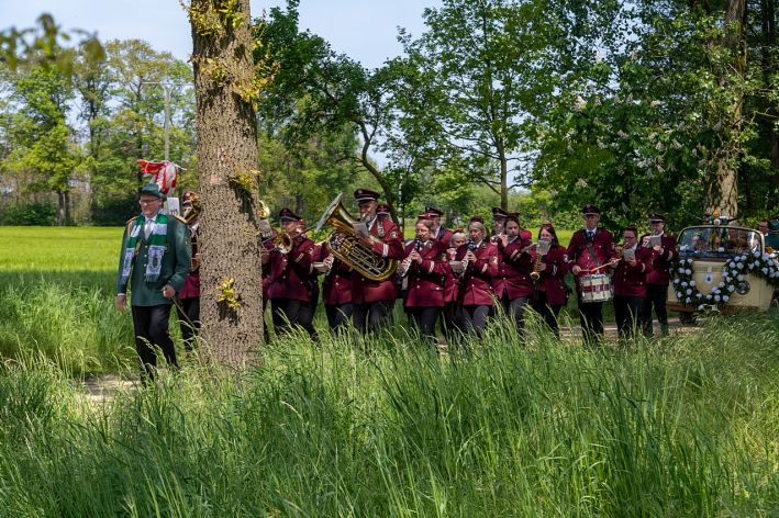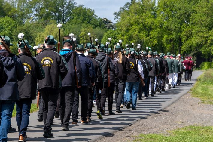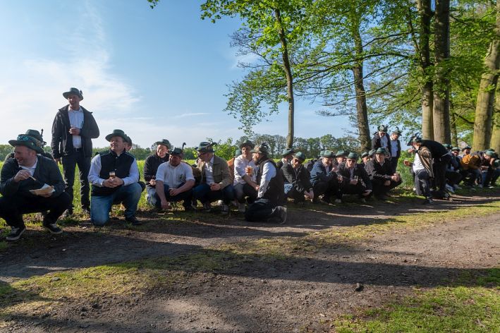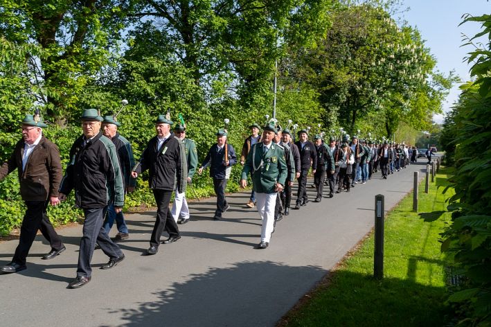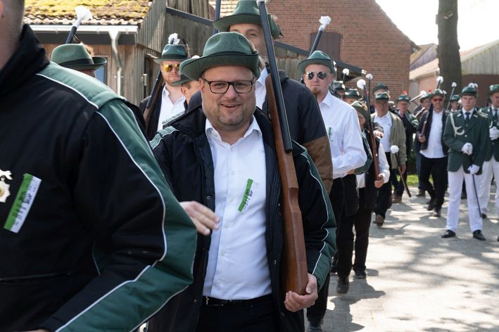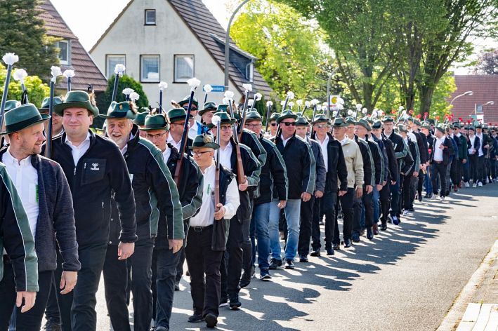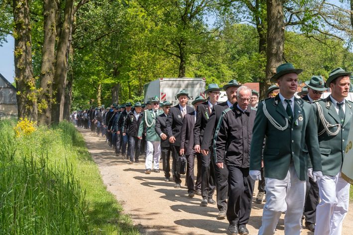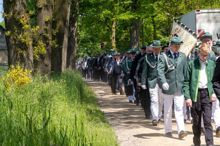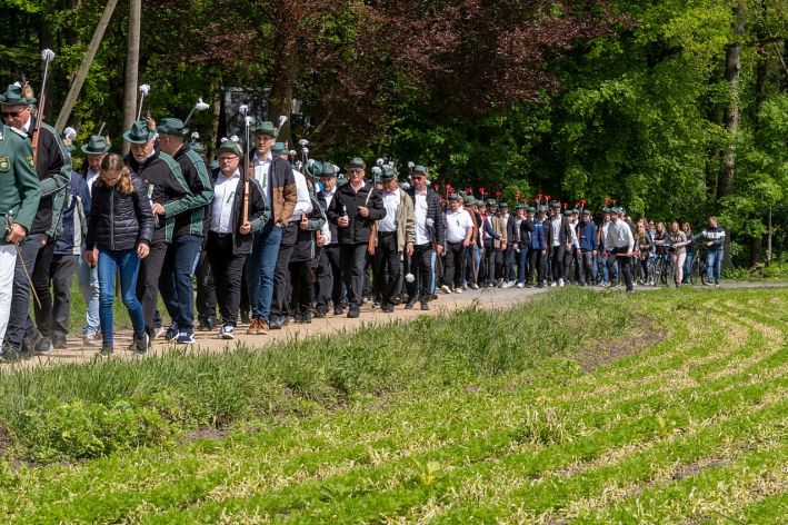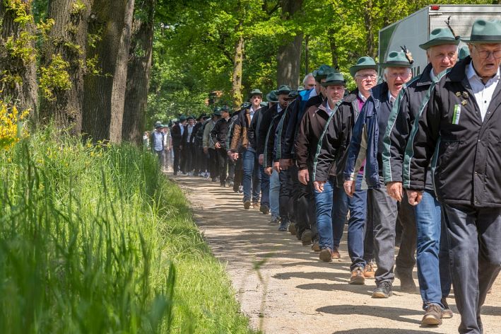 Dann folgte der Marsch durch frisches Frühlingsgrün zur Schützenhalle auf dem Hof Kaup-Hertger.
