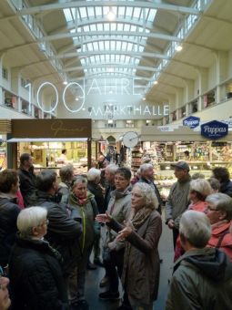 Die erste Station des Stadtrundganges waren die 100 Jahre alten Markthallen, das alte und das neue Schloss in der Stadtmitte.