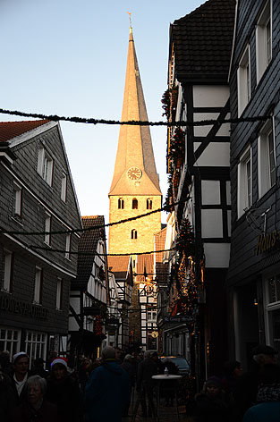 Wenn Weihnachtsmelodien erklingen und der Duft von Glühwein, gebrannten Mandeln und Bratäpfeln in der Luft liegt, ja dann zieht es den Goxeler wieder in die weite Welt der Weihnachtsmarktes. In diesem Jahr zog eine kleine "Horde" nach Hattingen zum historischen Weihnachtsmarkt. Man wurde sofort von den Weihnachtsmännern begrüß und der schiefe Turm der Sankt Georg Kirche wurde zum zentralen Orientierungspunkt auserkoren. Dass der Kirchturm so schief ist, lag zu dieser Zeit keinesfalls am Glühwein! – sondern an der Rache eines zu schlecht bezahlten Zimmermanns.
