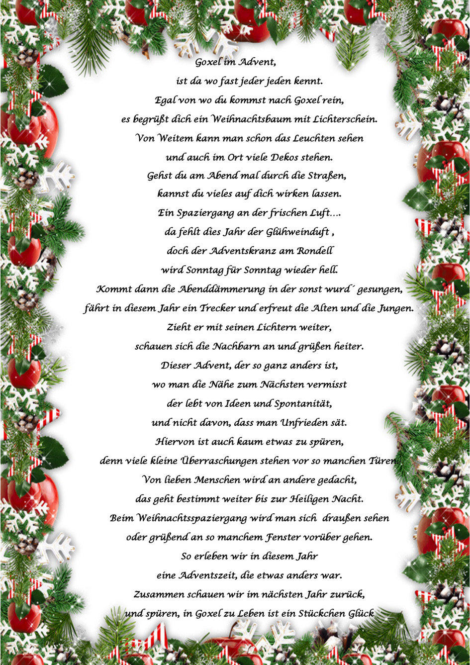 Die Weihnachtszeit wäre nicht komplett ohne einen Ausflug der Goxeler Nachbarschaft Wittenfeld zu einem Weihnachtsmarkt. Also hat sich Goxel vorweihnachtliche Gedanken gemacht und hat für die diesjährige Glühweinwanderung der Nachbarn zum Weihnachtsmarkt Soest aufgerufen.