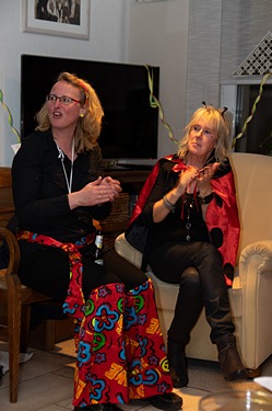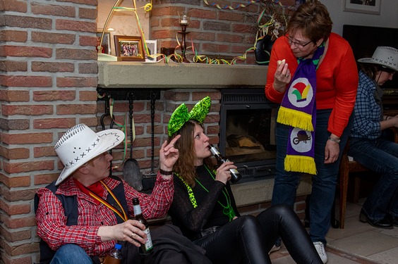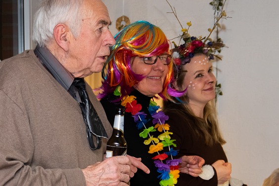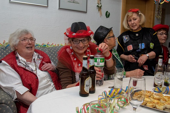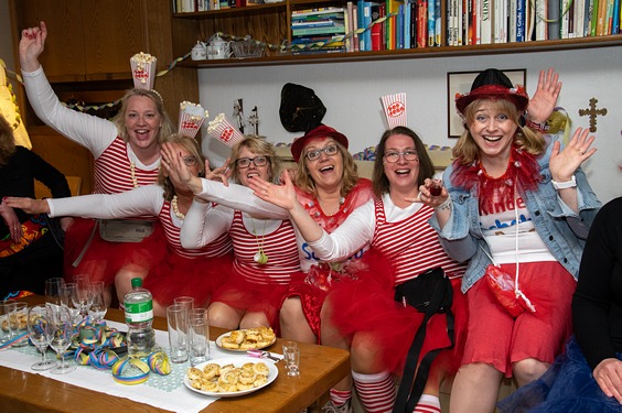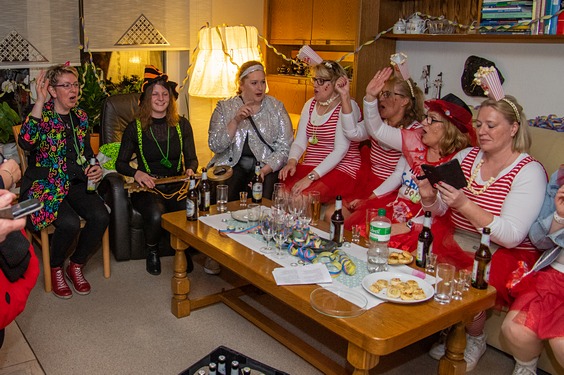 Bis schließlich alle bei Margret und Bernhard im Wohnzimmer landen. Gute Stimmung ist hier garantiert, Margret, Bernhard und Christian sorgen bestens für die jecken Weiber.