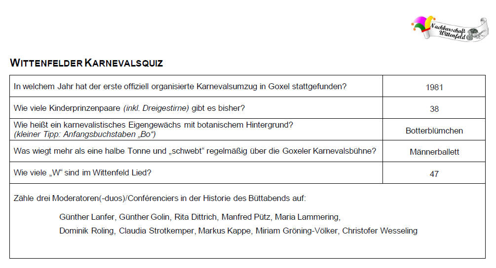 Der Karneval 2021 wird leider nur in den Herzen der sonst so zahlreichen Aktiven und Besucher der Veranstaltungen der Nachbarschaft Wittenfeld stattfinden können. Büttenabend und Karnevalsumzug müssen in 2021, wie von der Landesregierung beschlossen, leider ausfallen. Auch die damit verbundenen Zeltfeste können aus Rücksicht auf die Gesundheit aller nicht stattfinden. Dies finden wir alle sehr bedauerlich. Aber auch wenn dies vielen weh tun mag, ist nichts anderes als eine komplette Absage vertretbar. Viel zu gerne wollen wir wieder gemeinsam schunkeln, tanzen und uns beim Büttenabend Tränen-lachend in den Armen liegen. Das dreifach, donnernde Wittenfeld WiLau wäre nach einem dreiviertel Jahr der pandemischen Einschränkungen fast wie ein Befreiungsruf. Hierauf werden wir alle noch wohl bis 2022 warten müssen…