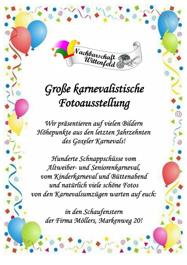 Ihr sollt alle mitmachen!!! Schmückt von Altweiber bis Rosenmontag eure Fenster und Vorgärten. Ob mit Kostümen, Figuren oder sonstigen jecken Utensilien! Verwandelt Goxel in ein buntes Karnevalsland.