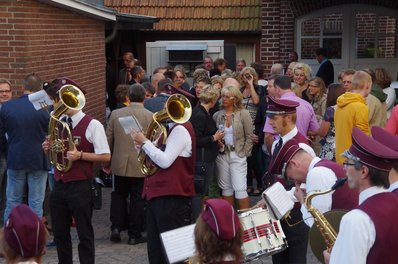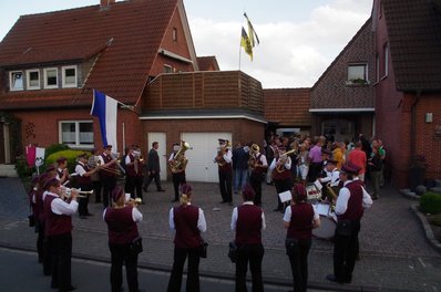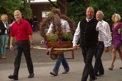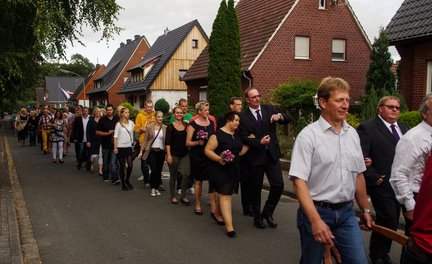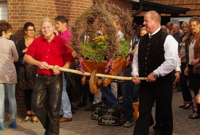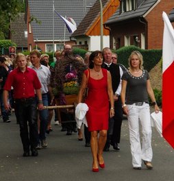 Traditionell wird das Heidekönigspaar mit dem Thron von Nachbarn, Freunden und Bekannten unter Begleitung des Jugendblasorchesters Hochmoor abgeholt.