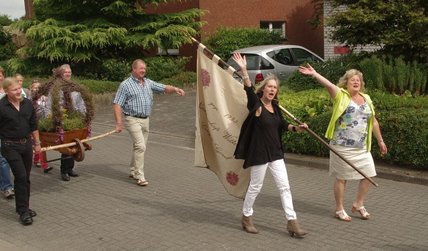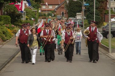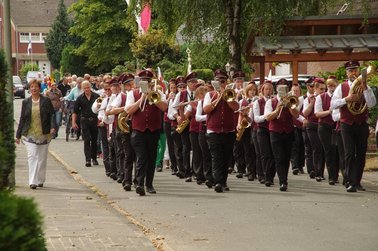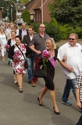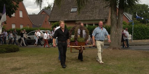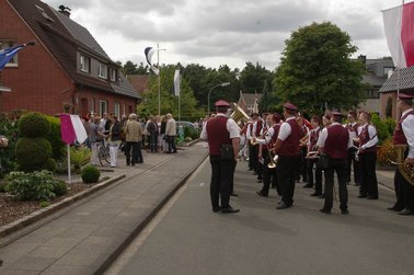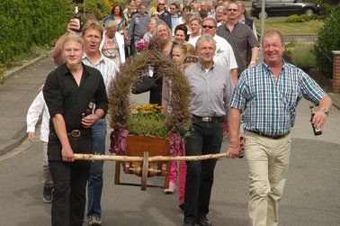 Zum Abholen des Heidekönigspaares aus dem letzten Jahr unter Begleitung des Jugendblasorchesters Hochmoor fanden sich Freunde und die Familie bei Heidekönig Andre ein. Sie begleiteten den scheidenden Thron in das Festzelt.