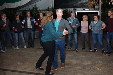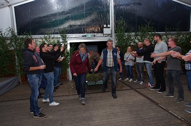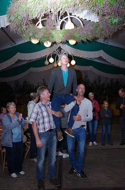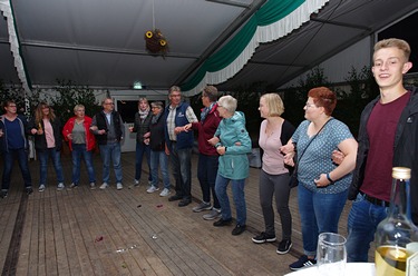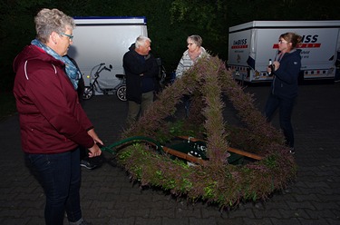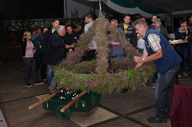 Am Freitagabend haben die Nachbarn mit überaus guter Beteiligung das Festzelt für das Sommerfest 2018 geschmückt. Von den Nachbarn wurde Rosen aus weißem und heidefarbenem Krepp erstellt, die dann an die Birkenzweige gebunden worden sind. Den Heidekranz banden in diesem Jahr letztmalig die Nachbarn vom Rekener Postweg. Nachdem der Kranz in aufwendiger Zeremonie in Zelt gebracht und unter das Zeltdach gehängt worden war, musste das noch amtierende Königspaar Michelle Kortüm und Sven Hermanns ein Tänzchen unter den Kranz hinlegen.