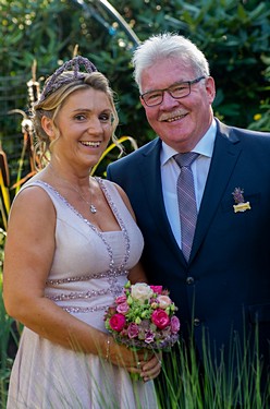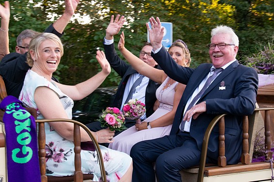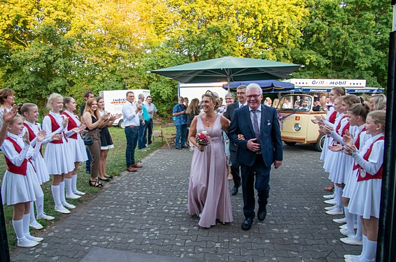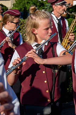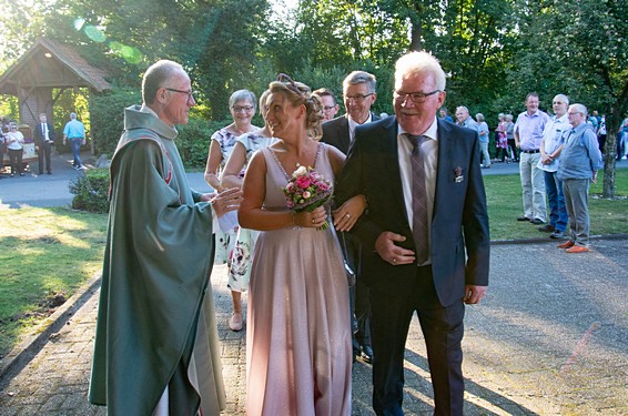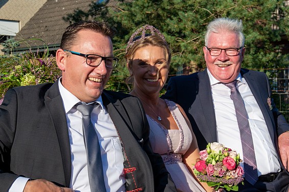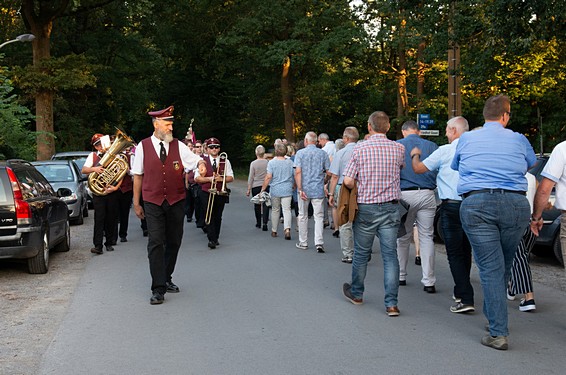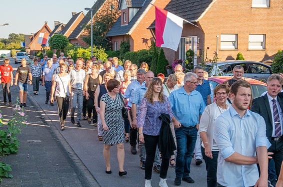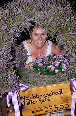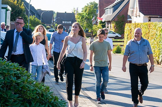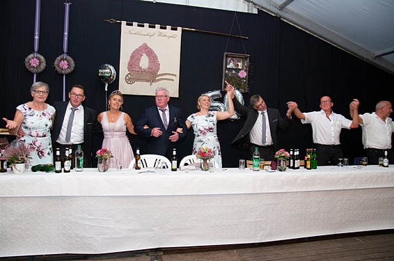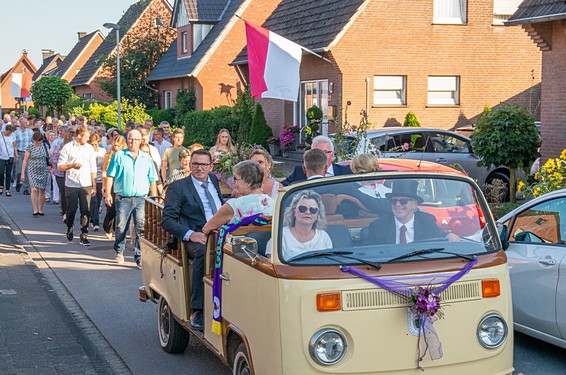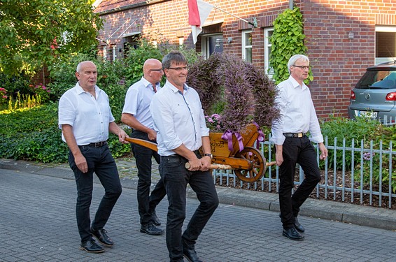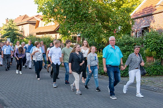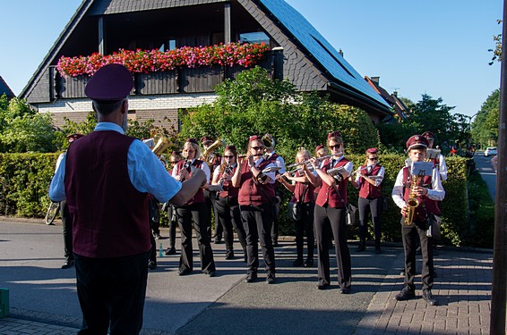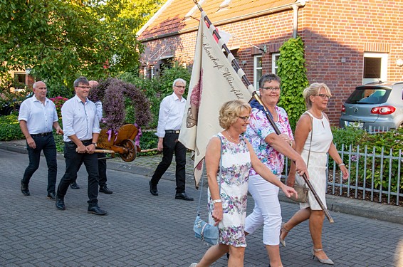 Richtig "in Schale" geworfen hatte sich das Heidekönigspaar der Nachbarschaft Wittenfeld des letzten Jahren zu ihrem letzten großen Auftritt in diesem Jahr. Am späten Nachmittag wurde sie mit ihrem Thron und vielen Gästen vom Haus des Heidekönigs abgeholt und mit Unterstützung durch das Jugendblasorchester Hochmoor zum Kirchgang geleitet.