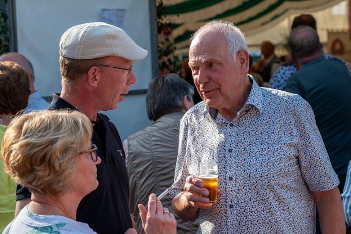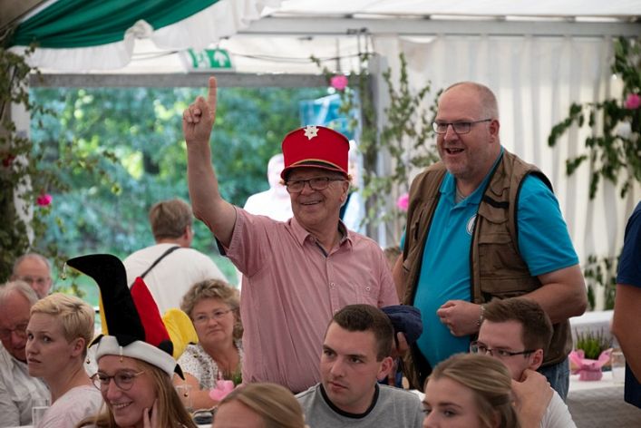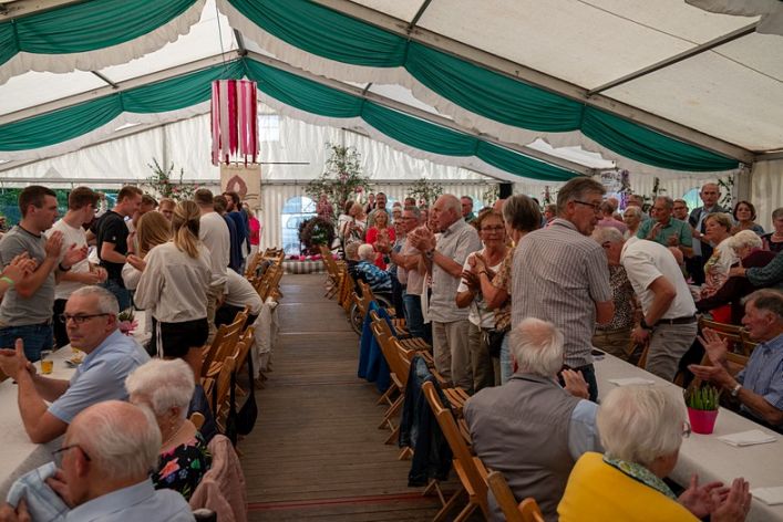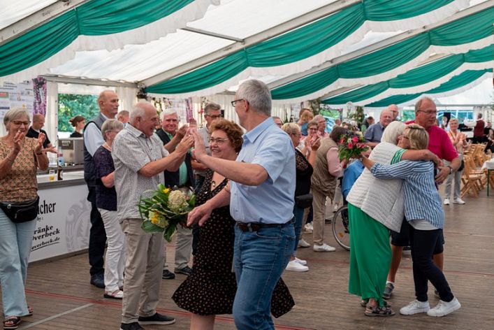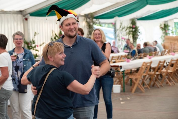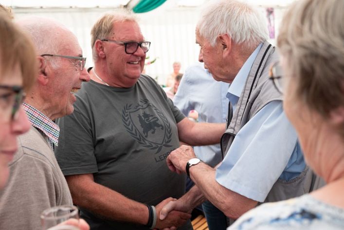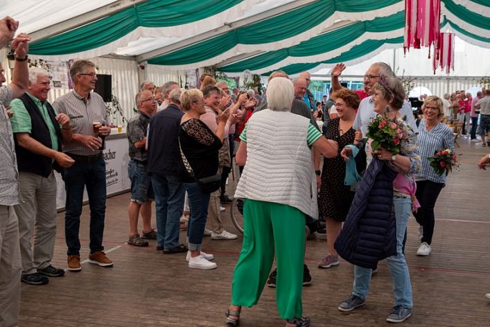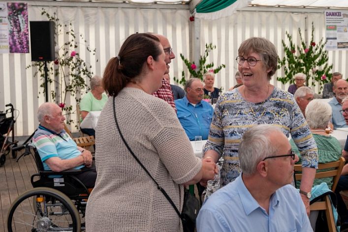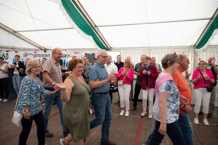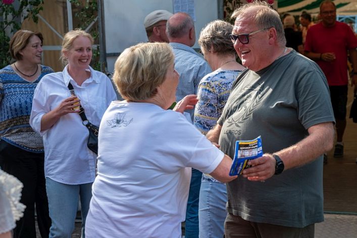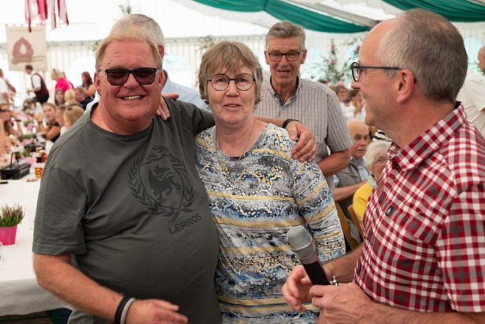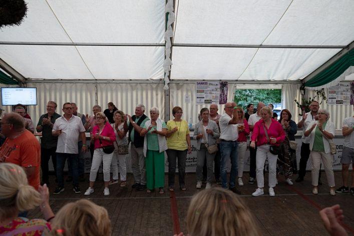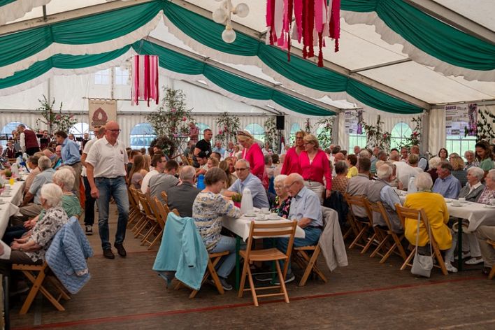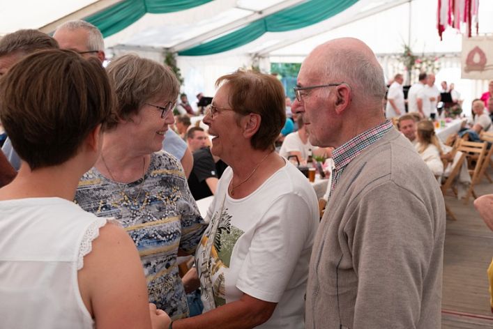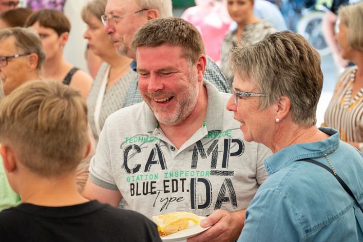 Im vollen Festzelt wurden die Nachbarn von den beiden Vorsitzenden der Nachbarschaft, Kerstin Renners und Volker Barenbrügge, herzlich begrüßt. Bei Kaffee und Kuchen war Zeit für einen kleinen Plausch unter Nachbarn.