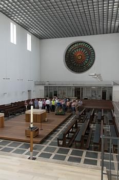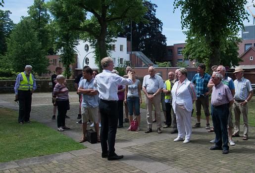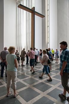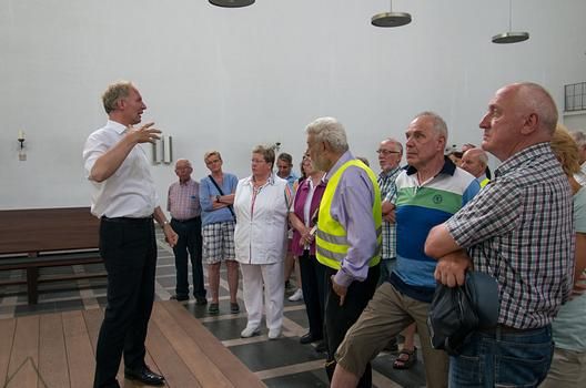 Karl Barenbrügge konnte nach dem Mittagsimbiss einen für viele alten und jung gebliebenen Bekannten begrüßten: Pfarrer Peter Nienhaus, Hausherr in der Hl.-Kreuz-Kirche in Dülmen, und früheren Kaplan in der Anna-Katharina-Gemeinde und damit auch in der Herz-Jesu-Kirche in Goxel. In einer sehr anschaulichen und ansprechenden Weise informierte Peter Nienhaus die Gäste aus Goxel über die vor einigen Jahren neu gestaltete Kreuz-Kirche. So manche bauliche Besonderheit wurde den Besuchern nach den Erläuterungen von Pfarrer Nienhaus verständlich. |