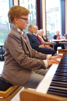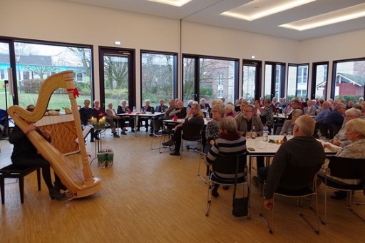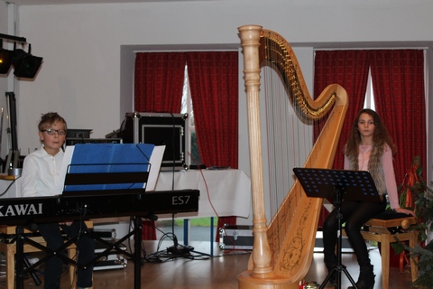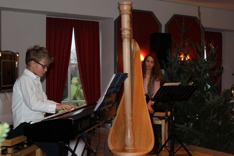 Nach einer kurzen Begrüßung durch Tanja Gerding und Maria Lammering sorgten Ronja (Harfe) und Connor (Klavier) Ehrbar für weihnachtliche Stimmung. Schon 2015 waren die beiden bei der Seniorenweihnachtsfeier aufgetreten. In diesem Jahr beeindruckten sie die Wittenfelder Senioren mit wunderbaren Klängen auf ihren Instrumenten. Neben aktuellen und klassischen Titeln spielten die beiden bekannte Weihnachtslieder und luden zum Mitsingen ein.