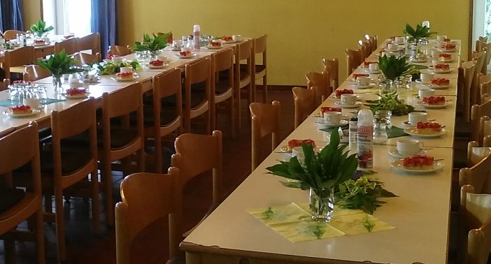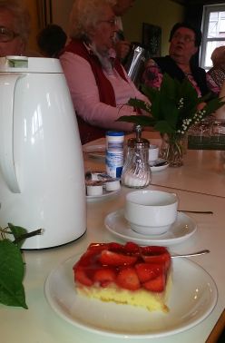 Zunächst gab es Kaffee und leckeren Erdbeerkuchen, serviert auf sehr schön dekorierten Tischen.