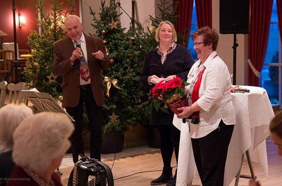 Als Überraschung gab es einen Gutschein für eine Torte zum Weihnachtsfest von Bäcker Mey. Vor der Feier wurde unter einen Stuhl ein Stern geklebt. Gertrud Koitka hat das Glück und saß genau auf dem Stuhl.