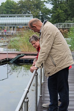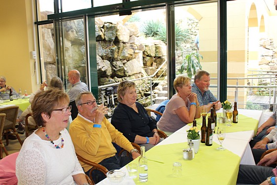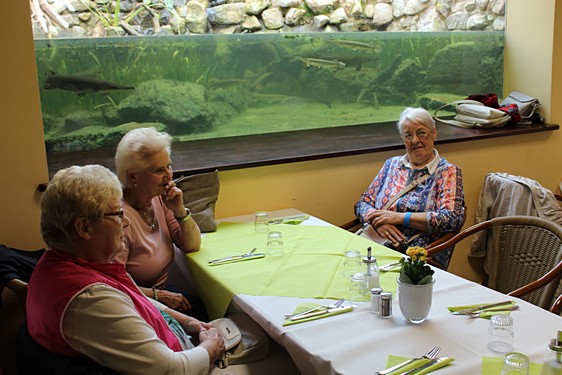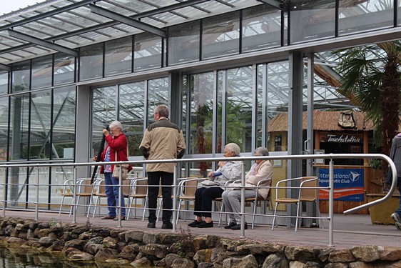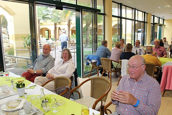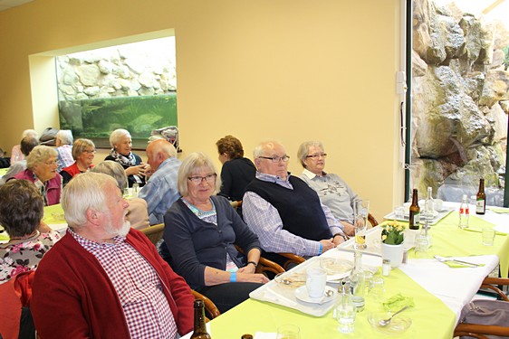 Im Palmenhaus wurde zum Mittag ein leckeres, abwechslungsreiches Büfett angeboten, auf dem jeder nach seinem Geschmack etwas fand. Nach anfänglich trübem Wetter bot sich am Nachmittag die Gelegenheit einfach nur die Sonne, die Luft und die Blumen zu genießen. Wer noch laufen wollte, umrundete die Tauchanlage und blieb auf der Seekanzel stehen um den Blick über einen weiteren naturbelassenen Teich schweifen zu lassen. Dort konnten verschiedene Vögel beobachtet werden.