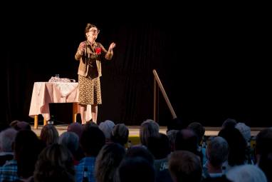 In ihrem Programm „Rolle rückwärts“ plaudert Frieda, die dem Publikum gleich das