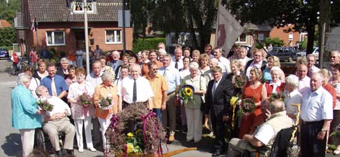 Groß war die Schar der Gratulanten, die noch an Ort und Stelle die Glückwünsche los werden wollten. Zum Thron gehören als Gefolge die Ehrendamen Maria Lammering und Maria Barenbrügge und sowie die Ehrenherren Alois Lammering und Karl Barenbrügge sowie natürlich die Ehepartner Dorothee Golin und Willi Kröger.