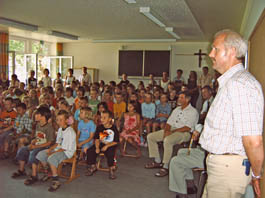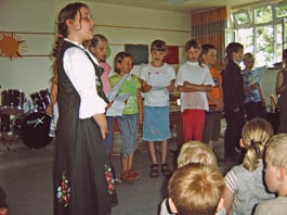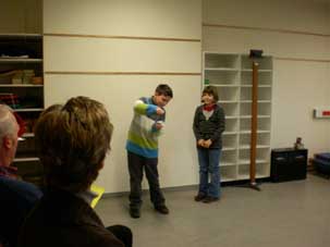 Zur Einstimmung eröffnete die Klasse 3a das Schülerprogramm instrumental unter der Leitung von Erich Pink. Unter anderem boten die Kinder einen Teil ihres im Musikunterricht einstudierten Repertoires und schlossen mit der Weisheit: „Unser Rektor weiß genau, sehr gesund ist der Kakao“.