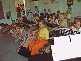 Das rein instrumental vorgespielte Stück „Freude schöner Götterfunken“ bewies erneut die gelungene Zusammenarbeit der Kinder mit Herrn Pink.