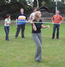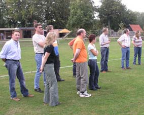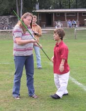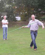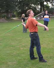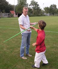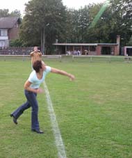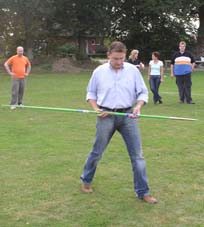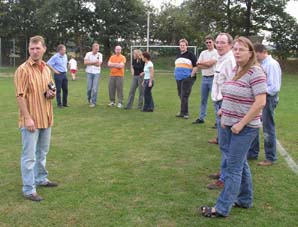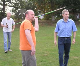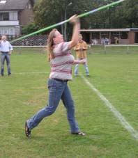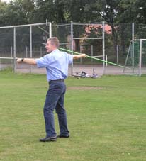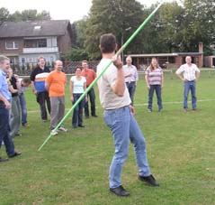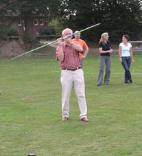 Und dann wurde es ernst: Die Sponsoren sollten auf dem Goxeler Heidesportplatz versuchen, mit dem Speer die WM-Weite von Mathias Mester von immerhin 34 Metern zu erreichen. Nicht annähernd ist dies allerdings trotz diverser Beratungen und Tipps des Weltmeisters gelungen. Die beste Weite erzielt noch Michael Uphues.