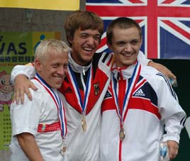Der strahlende Weltmeister Mathias Mester (Mitte) mit Marek Margoc und Martin Andrew.